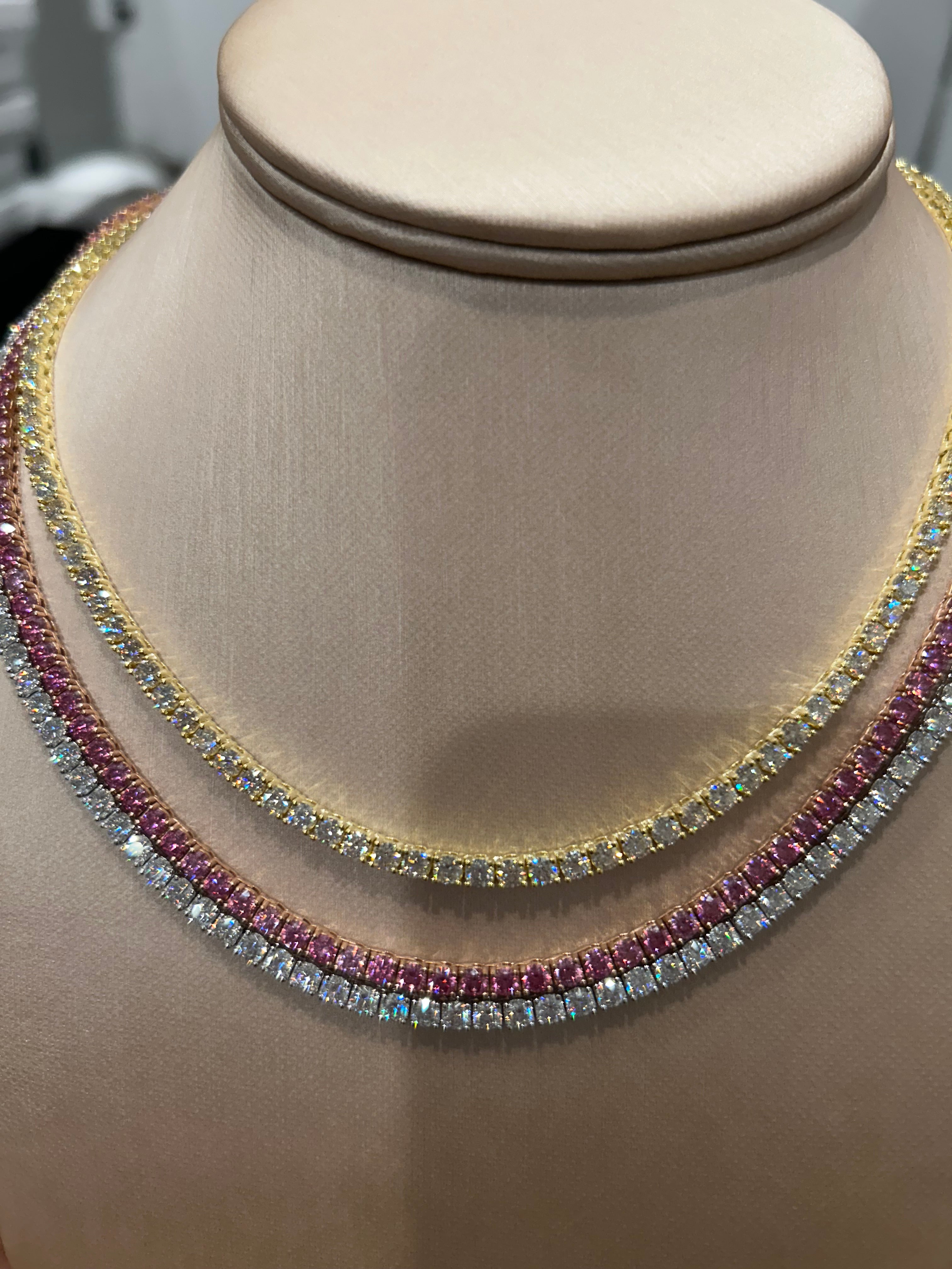 Moissanite Tennis Necklace is an elegant and sophisticated piece of jewelry that combines timeless design with modern brilliance. This necklace features a continuous line of 3 mm moissanite gemstones, each carefully selected for their exceptional clarity and fire. Moissanite, known for its stunning sparkle and durability, rivals diamonds in its brilliance and is a popular choice for those seeking an ethical and cost-effective alternative. The gemstones are set in a secure and polished metal setting, typically made of gold or platinum, which enhances their radiance and ensures they remain securely in place. This necklace is perfect for adding a touch of glamour to any outfit, whether for a special occasion or everyday wear. Its classic tennis design ensures it will never go out of style, making it a timeless addition to any jewelry collection.